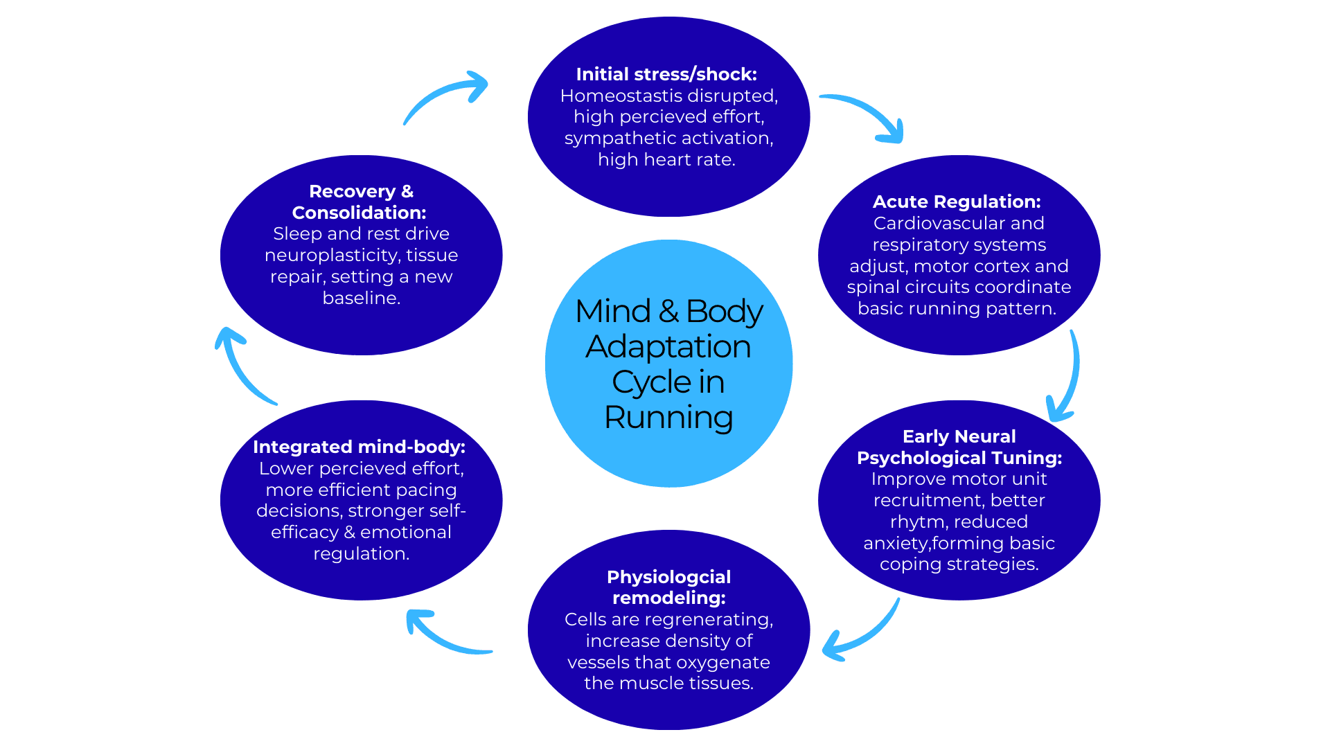 Now that the overall functioning is layed out; how does it react when you are running? Below is a clear cycle of the process that takes place when you begin to run, after, and even later when you begin to set new running goals: