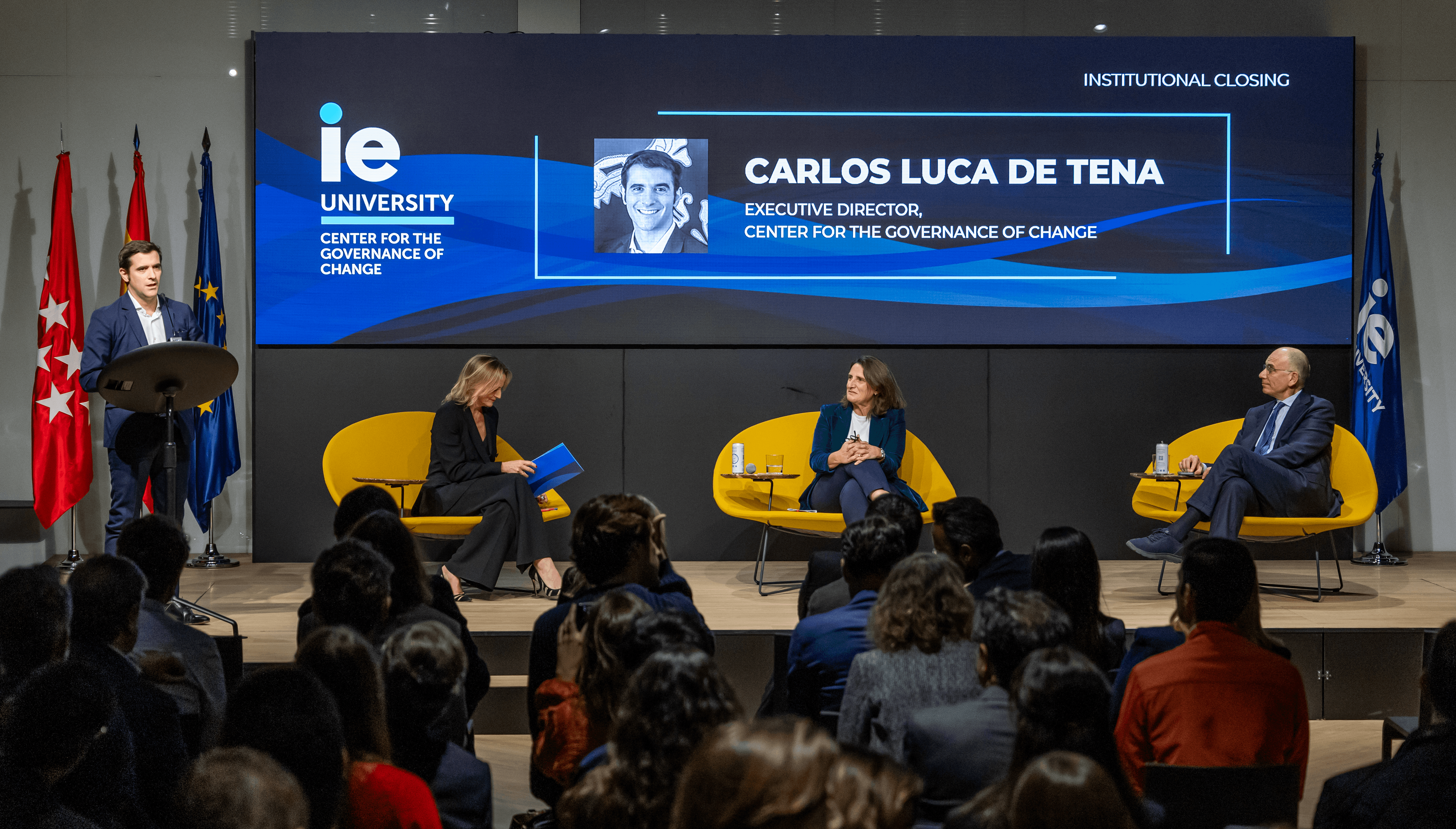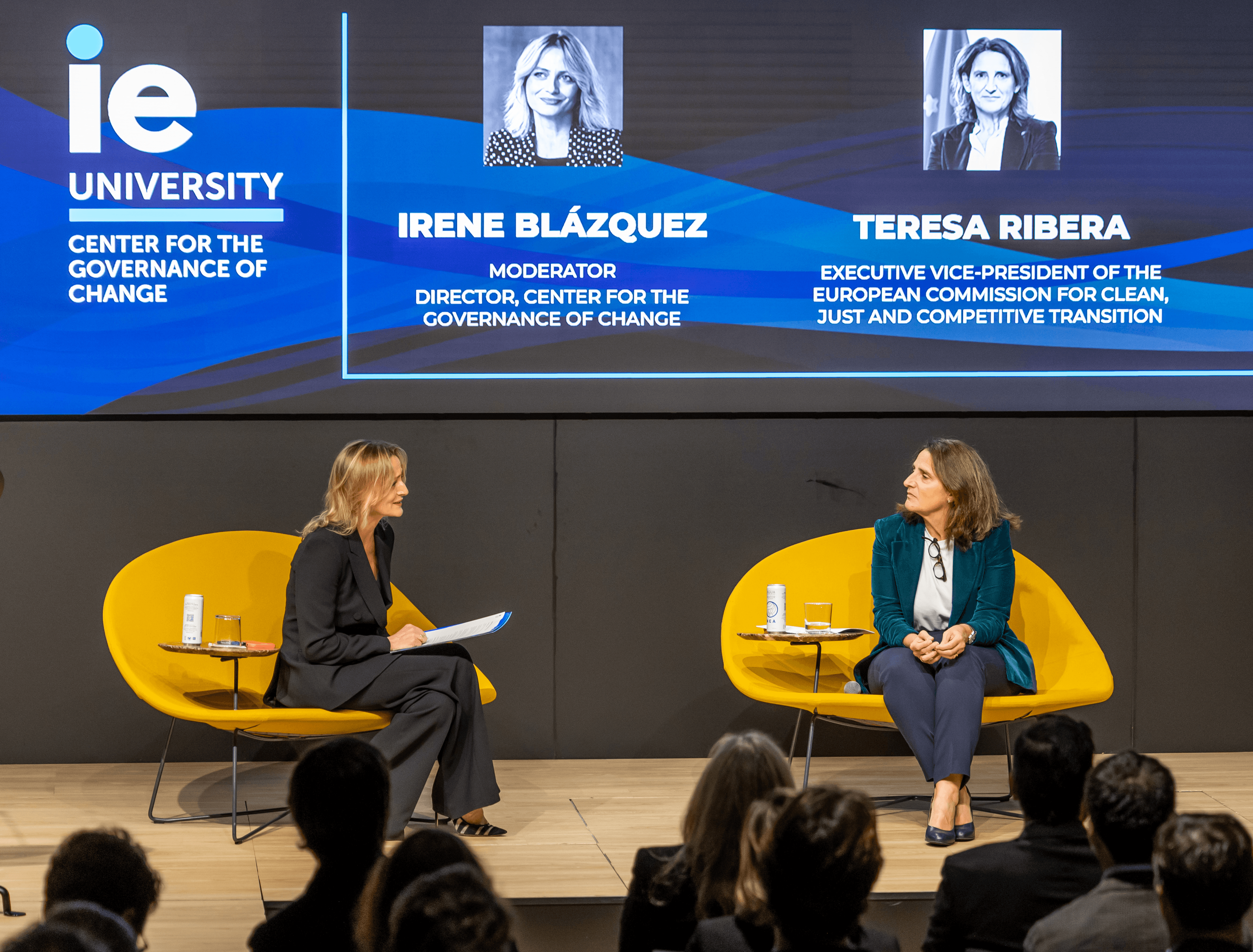 On October 30, 2025, the Center for the Governance of Change (CGC) at IE University hosted a public conversation between Teresa Ribera, Executive Vice-President of the European Commission for Clean, Just and Competitive Transition, and Enrico Letta, Dean of the School of Politics, Economics and Global Affairs at IE University, on the challenges and opportunities facing Europe in the age of AI. In their conversation, Vice-President Ribera emphasized that we are living through a turbulent rebalancing of the global order, a time when mutual cooperation and respect for the rule of law will be crucial to ensure prosperity and peace. In this context, she called Europeans to continue building a stronger Union, keeping in mind our values and principles and promoting a renewed European Dream. “I feel proud of Europe,” she stated. “We have things to improve, but we have an inspiring and powerful model that can serve as a global public good.”