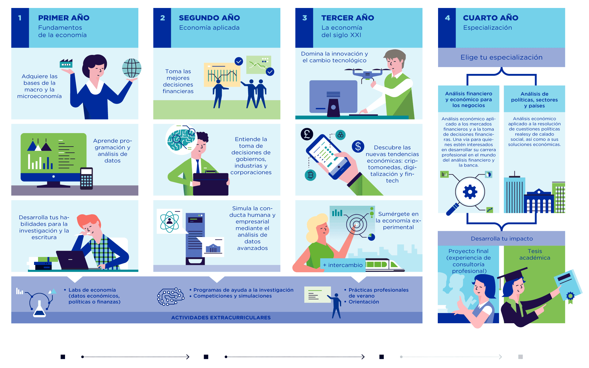 Durante este último curso, tú mismo serás el responsable de diseñar tu programa. Si eliges el itinerario de Análisis Económico y Financiero de Empresas, tus estudios se centrarán en las novedades digitales, los avances tecnológicos y en la relación que estos pueden tener con la economía. Si eliges el itinerario de Análisis Geográfico, Sectorial y Político, la formación estará enfocada a las ciencias políticas y a cómo las ciudades y el medio ambiente tienen un papel fundamental a la hora de dar forma al futuro de la economía.