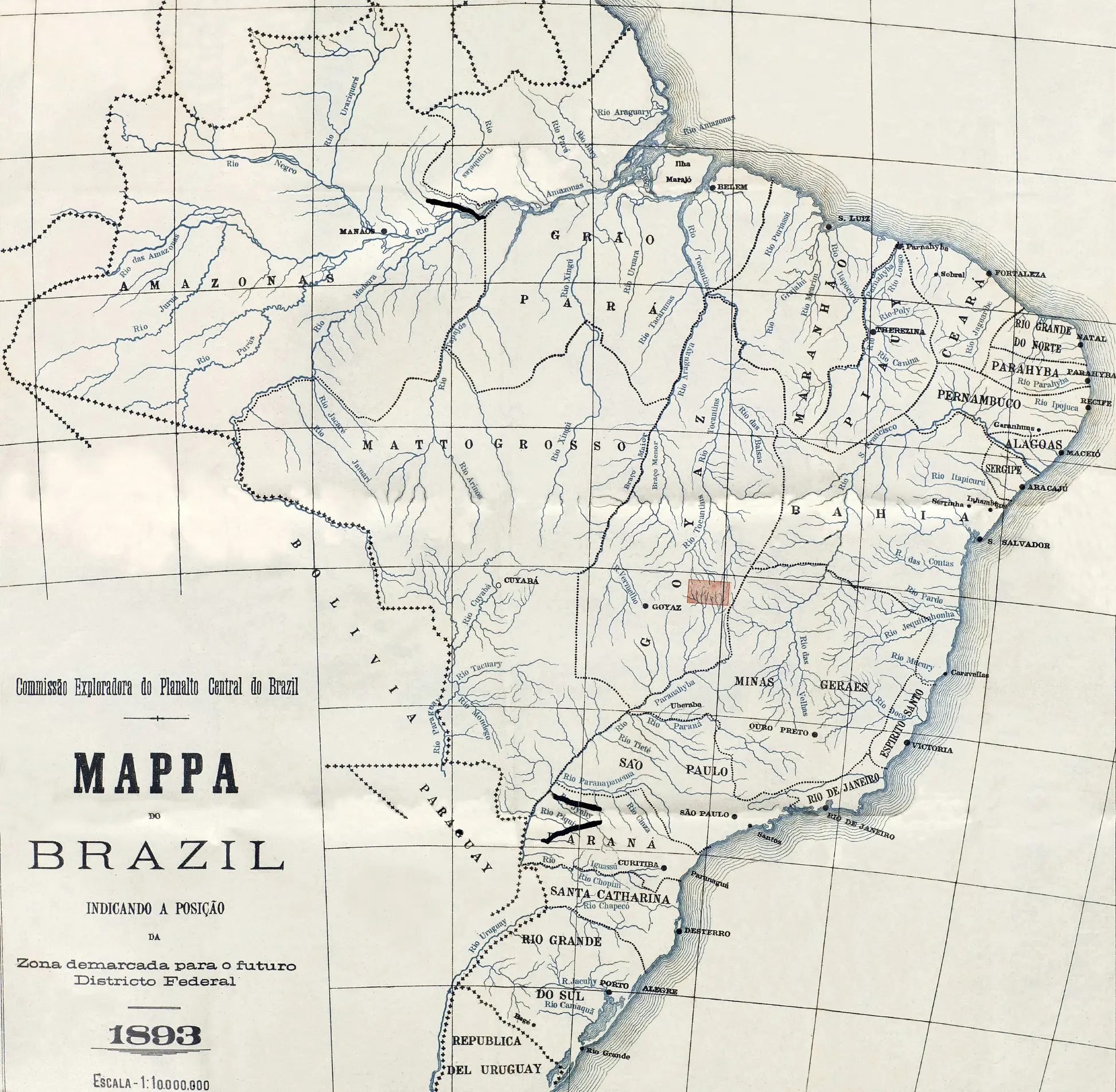 Map of Brazil from 1893 showing the “Cruls Rectangle”, the future site of Brasilia.