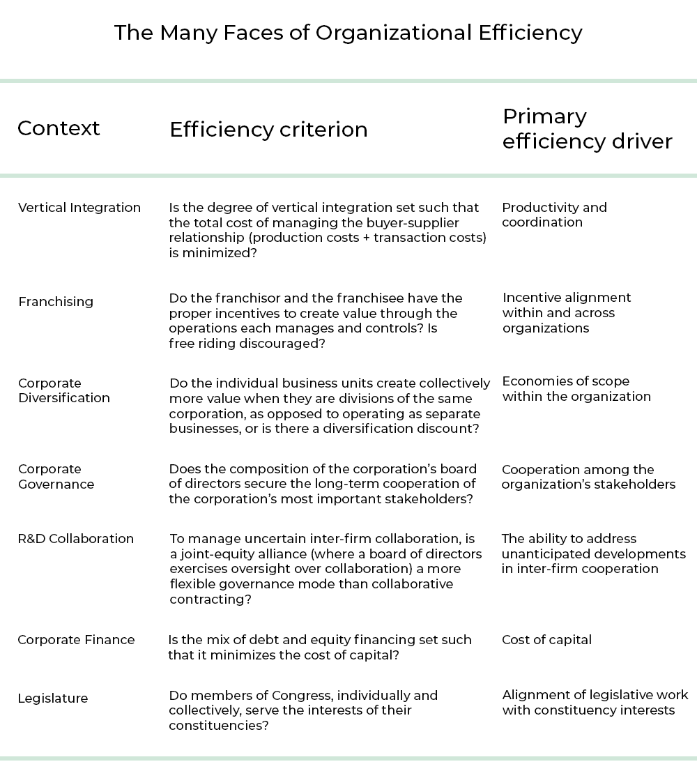 Efficiency comes in many guises. In my collaboration with organization economist and strategy scholar Joe Mahoney of the University of Illinois, we have cast a wide net to unearth and analyze different manifestations of efficiency in different organizational contexts (available in a forthcoming book published by Oxford University Press.) The following table provides seven different examples of organizational efficiency and its drivers.