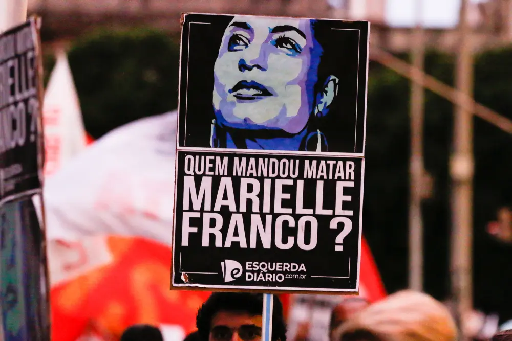 Placard reading “Who ordered the killing of Marielle Franco?” held at a protest in Rio de Janeiro, 2019.