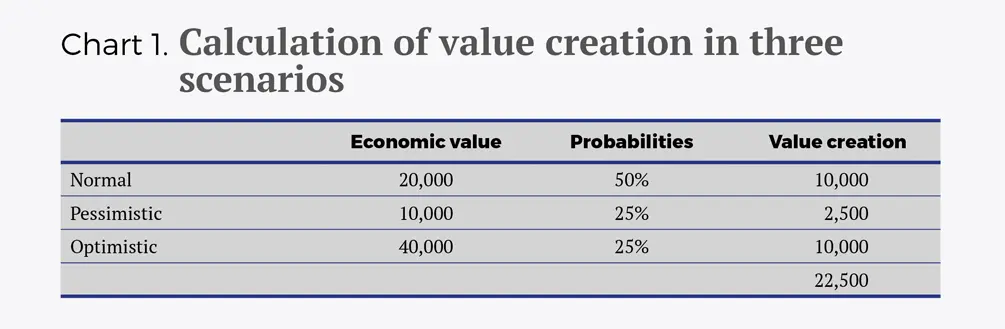 One way to incorporate the value of operational flexibility into the value obtained through DCF is to discount estimated cash flow based on the probabilities that a given scenario will materialize. In this case, the traditional DCF becomes dynamic since it factors in the probabilities of possible scenarios occurring. This is best illustrated with an example of investment analysis on a future project (see Chart 1), which reflects three possible scenarios of business development: Normal, optimistic and pessimistic. Every one of these would generate economic value, but they all have different probabilities, so the weighted average economic value would be 22,500 monetary units. In each case, we would need to analyze the value creation with the cash flows including the various actions that are taken based on the expected events (e.g., liquidating the business at a certain point in the pessimistic scenario or expanding it after reaching a particular level of cash generation).
