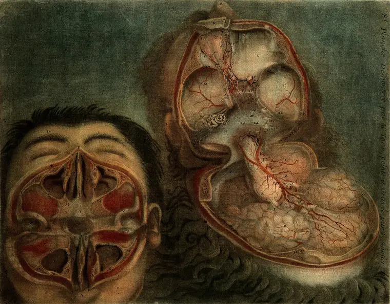 Face and brain: dissections, J.F. Gautier d’Agoty, 1748.