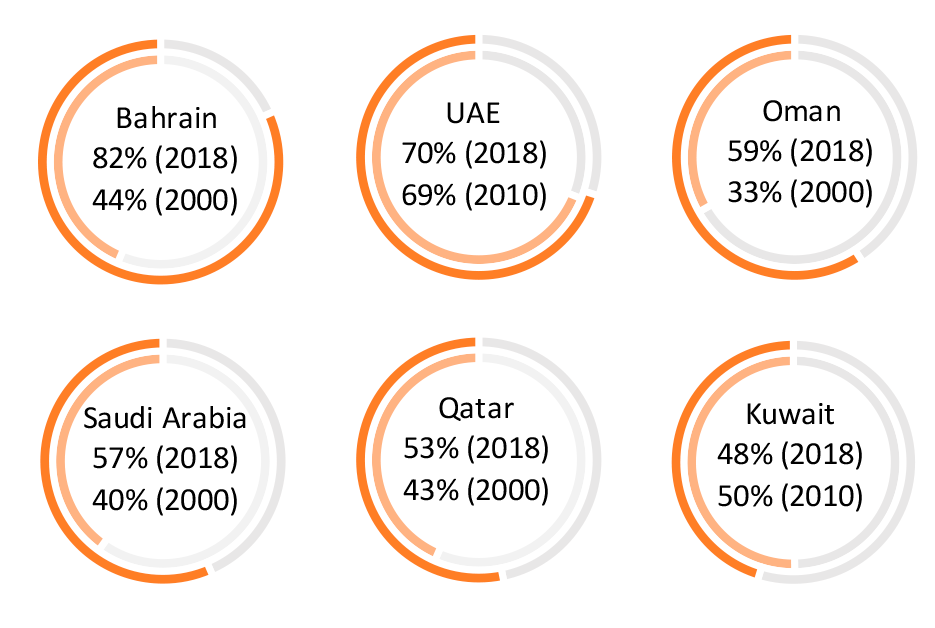 Graph 1: GDP percentage of non-oil-related sectors in Gulf Cooperation Council countries | Source: World Bank (2019).