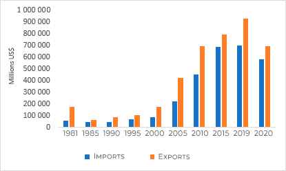 Graph 2: Gulf Cooperation Council trade with the rest of the world (1981-2020) | Source: World Trade Organization (2021).