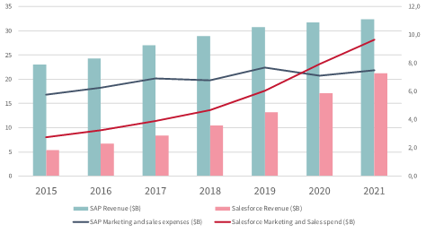 SAP vs. Salesforce revenues and marketing expenses (2015-2021)