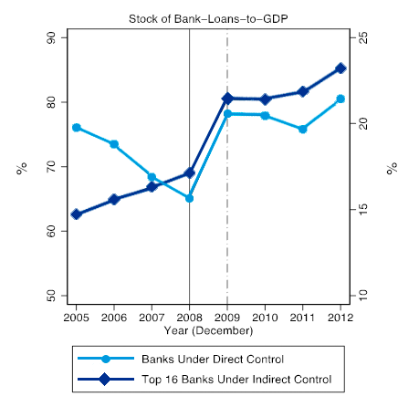 Figure 2: This figure shows that all banks followed the mandate of the Chinese government to try to lend more. It plots the ratio of bank loans to GDP for two types of banks in China. The solid line represents the total bank loans to GDP for all banks that are directly under state control. The dashed line plots the same ratio for 16 of the largest banks that are indirectly controlled by the government. Together, these two groups account for most of the bank lending in China. Comparing this ratio from the end of 2008 (when the credit shock occurred) to the end of 2010 shows that both groups increased their lending sharply and in a remarkably similar fashion.
