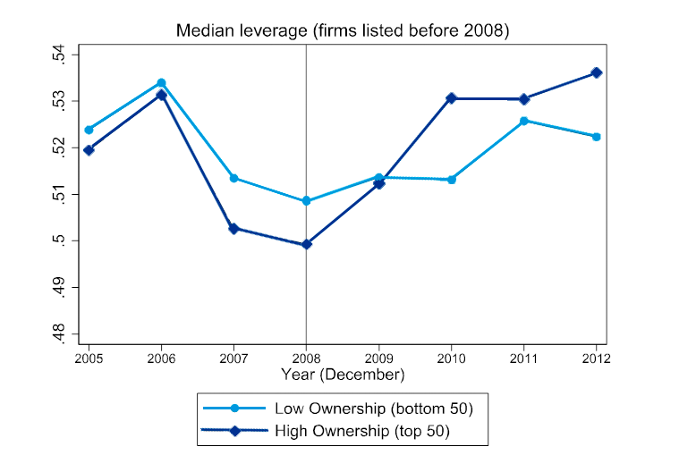 Following the capital structure literature, we excluded financial firms from our sample because they have higher leverage and are much more regulated than any other industry. Then, we compared the leverage in the pre- and post-stimulus periods exploiting cross-sectional differences in executive ownership levels across firms.