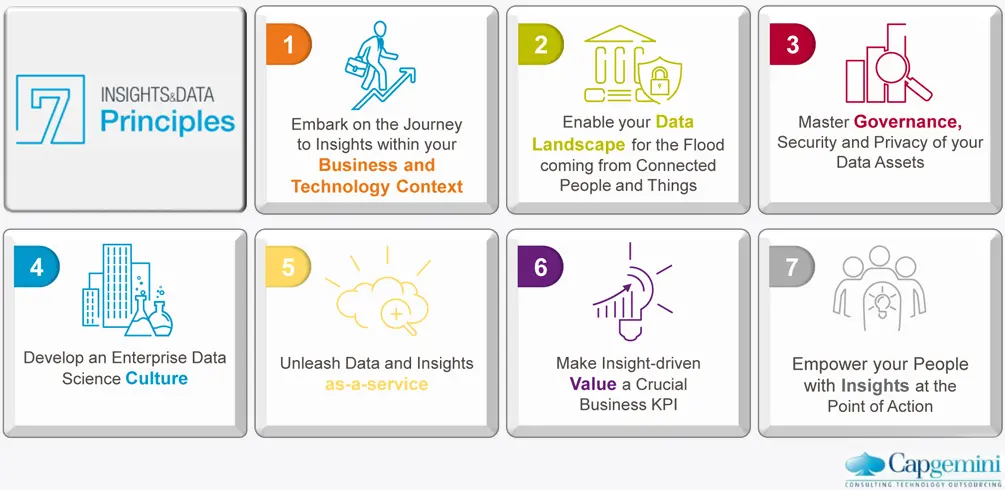 Capgemini Insights & Data propone siete principios para incluir en el ADN de una compañía la utilización de los datos. Hay que pensar que son una palanca transformadora y, para ello, es necesario entender el concepto de negocio y tecnológico del que se parte y definir el concepto al que se quiere llegar: