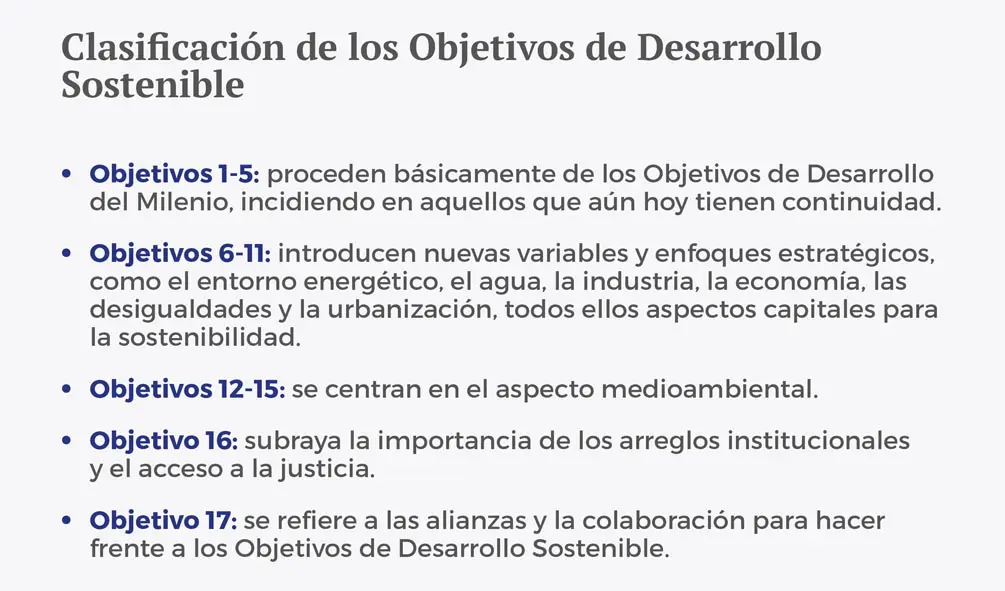 Los ODS y la Agenda 2030 serían, por tanto, una solución de continuidad a los anteriores ODM, sirviendo como guía estratégica para gobiernos y organizaciones. En comparación con los ODM, los ODS llevan los resultados previstos mucho más allá, ya que los aplican universalmente; es decir, a todos los países, no solo a los países en desarrollo. El medioambiente, la inclusión social y el desarrollo económico deben medirse bajo una misma mirada sostenible.