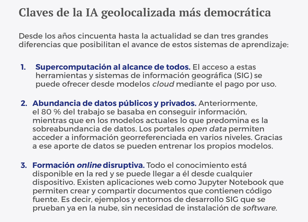 Los proyectos de IA y big data en el ámbito geográfico siguen un mismo patrón, cuya primera fase es la importación de información desde distintas fuentes. Posteriormente se trabaja en la construcción del modelo con un conjunto de datos distribuidos en capas que deben “entrenarse y compararse” para, finalmente, establecer una solución.