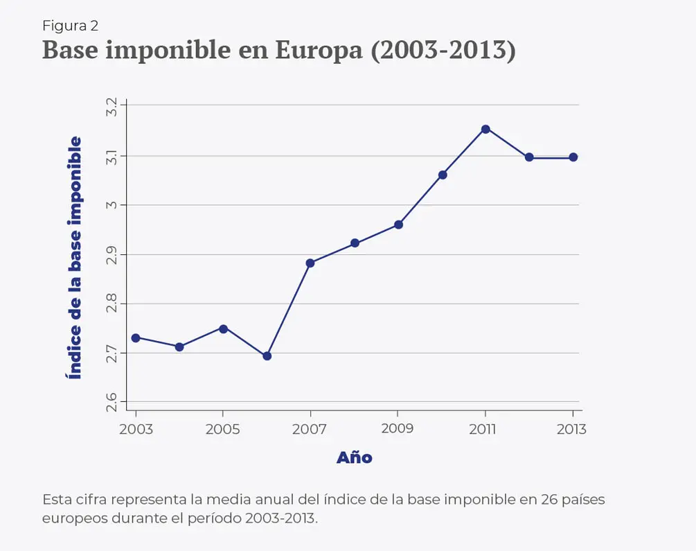 En un intento de abordar el fenómeno, los responsables de formular políticas para impedir la evasión fiscal en todo el mundo han puesto en práctica diversas medidas. En particular, los países europeos han endurecido durante la última década las normas para evitar la evasión fiscal. Así, han reducido la tasa del impuesto de sociedades (véase la figura 1) y han ampliado la base imponible, es decir, han aumentado la parte de los ingresos sujetos a impuestos (véase la figura 2). Los reguladores de la Unión Europea (UE) afirman que estas reformas han sido efectivas. Sin embargo, a pesar de la relevancia de esta afirmación, los estudios económicos realizados no han probado su certeza.