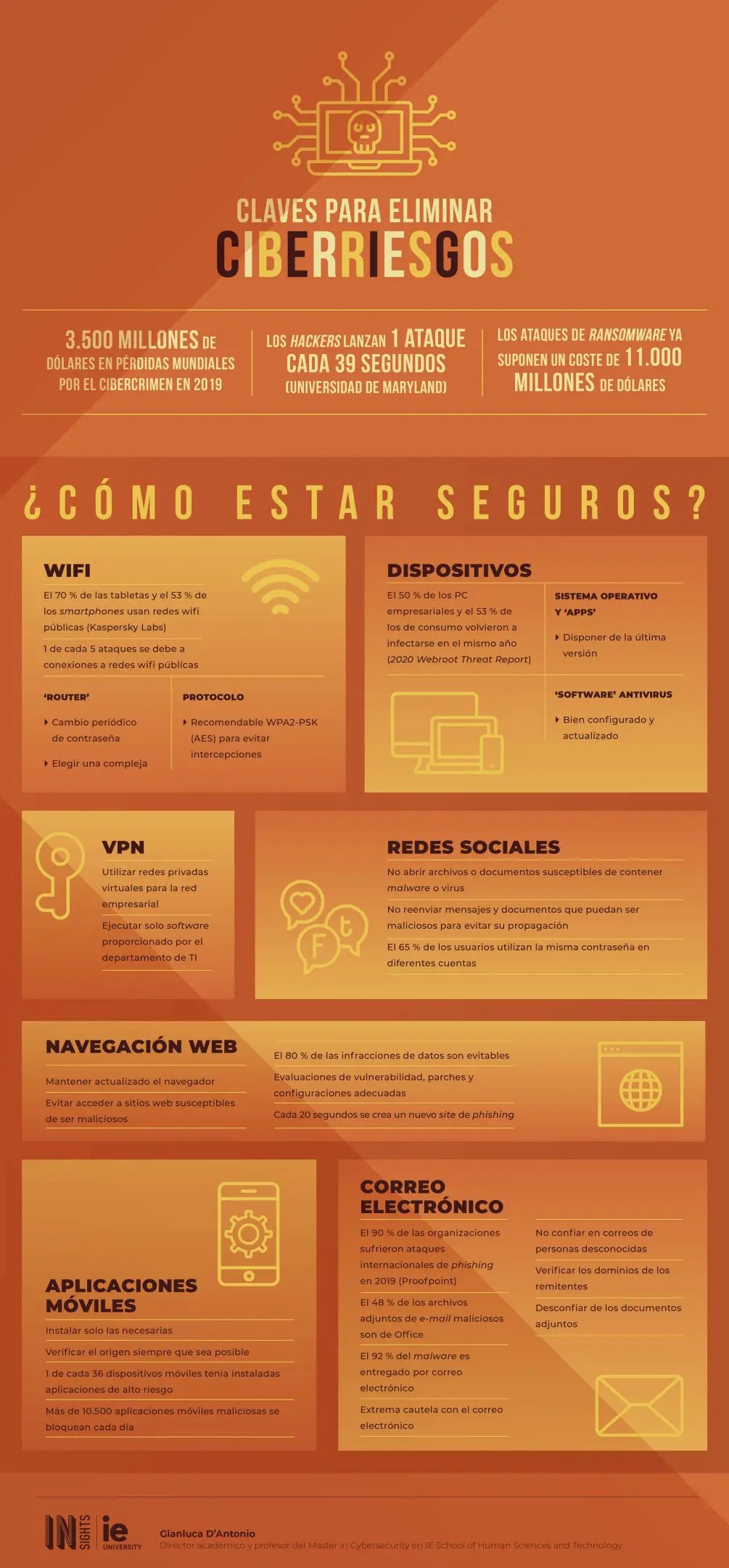 Paralelamente al creciente uso de nuevas tecnologías asistimos a la proliferación de amenazas de ciberseguridad que hacen uso de técnicas cada vez más complejas. Lejos quedan los tiempos en los que se predicaba la importancia de disponer de un antivirus. Hoy, los ciberriesgos requieren un enfoque holístico de seguridad que aborde aspectos como los que señala en esta infografía Gianluca D’Antonio, director académico del Master in Cybersecurity en IE School of Human Sciences and Technology.