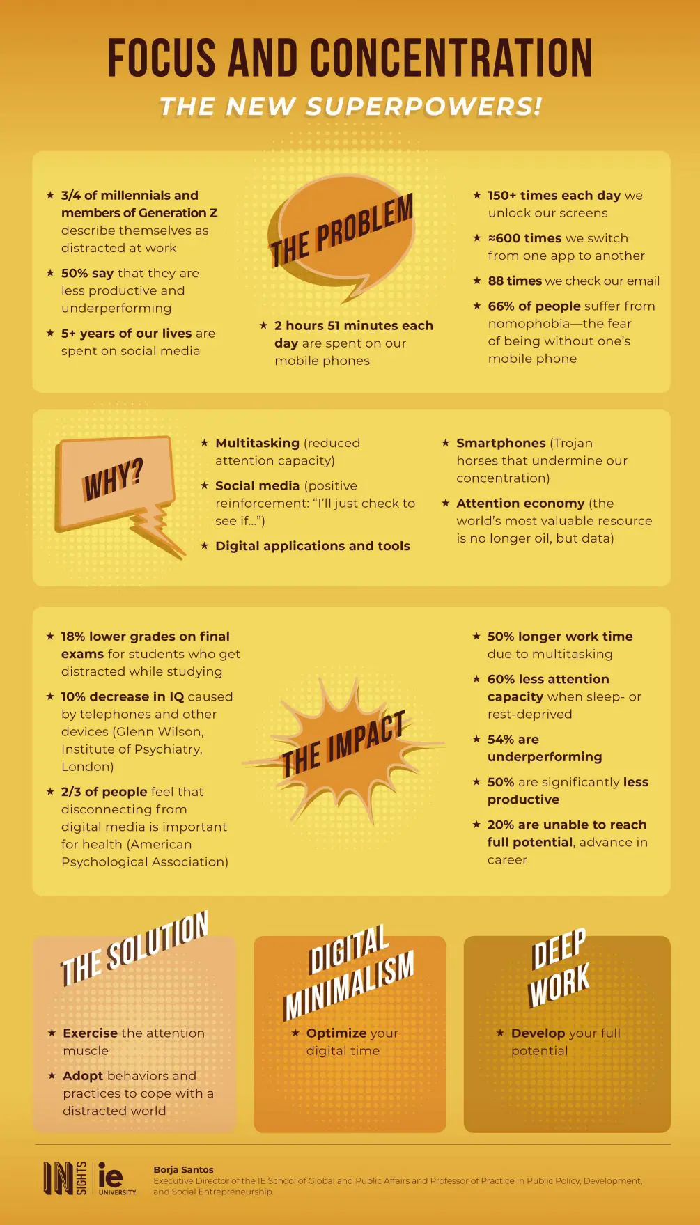 The numbers tell the story: the vast array of stimuli in today’s society is chipping away at our attention span and ability to concentrate. In this infographic, Borja Santos, Executive Director of the IE School of Global and Public Affairs and Professor of Practice in Public Policy, Development, and Social Entrepreneurship, highlights the main triggers of distraction and their impact on our lives, as well as some cures for this 21st-century affliction.