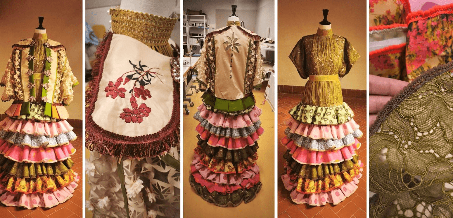 From the Spanish side, Claudia Martínez Larive’s research translated Andalusian references into spatial and kinetic principles. The expressive volume of the flamenco dress informed a silhouette that reacts to the body in motion. The fan introduced a logic of modularity and unfolding in the relationship between layers and panels. The torero jacket contributed the idea of ornamental structure, where decoration is inseparable from construction. Together, these references shaped a design language centered on movement, layering, and performative presence rather than stylistic quotation