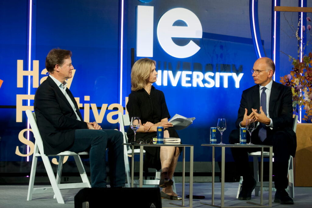 Finally, the auditorium fills for the main event. Enrico Letta, former Prime Minister of Italy and now Dean of IE School of Politics, Economics & Global Affairs, takes the stage alongside Sir Nicholas Clegg, former Deputy Prime Minister of the United Kingdom and now Vice President of Global Affairs at Meta. It’s a compelling double act: Silicon Valley pragmatism meets European idealism.