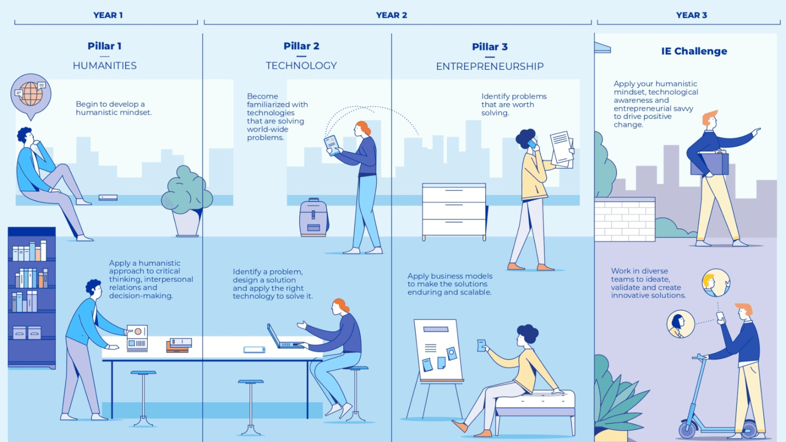 Consisting of courses in the Humanities (6 ECTS), Technology (3 ECTS) and Entrepreneurship (6 ECTS), IE IMPACT reinforces these three foundational pillars of IE University, and centers Diversity and Sustainability throughout the entire learning journey, which culminates with the IE Challenge (6 ECTS).
